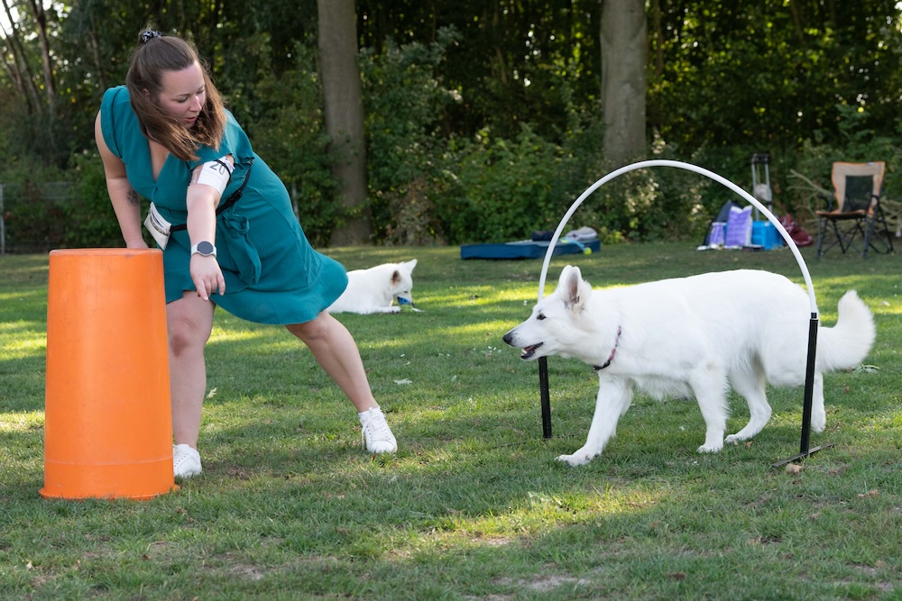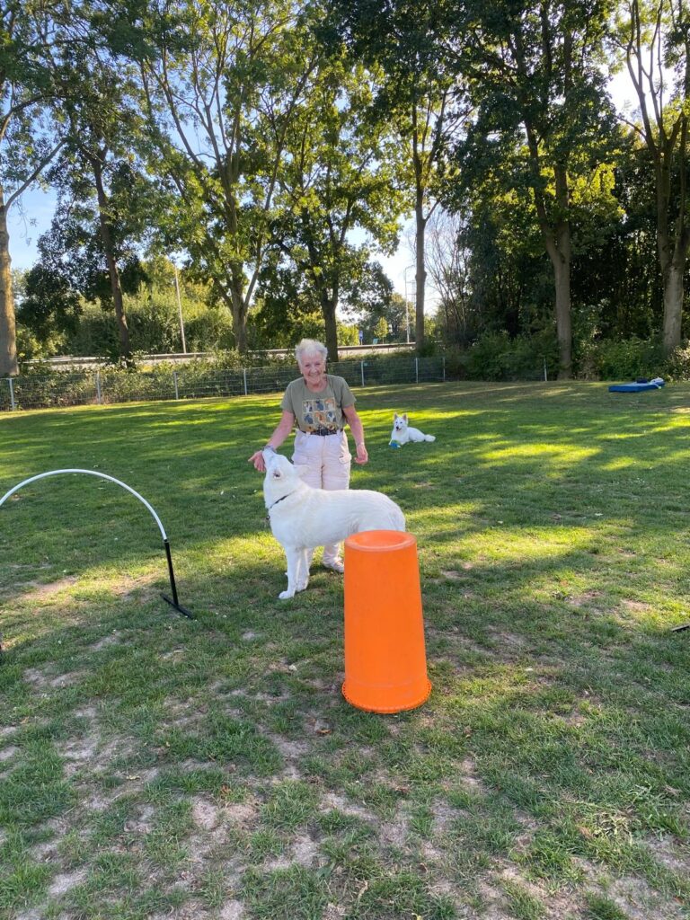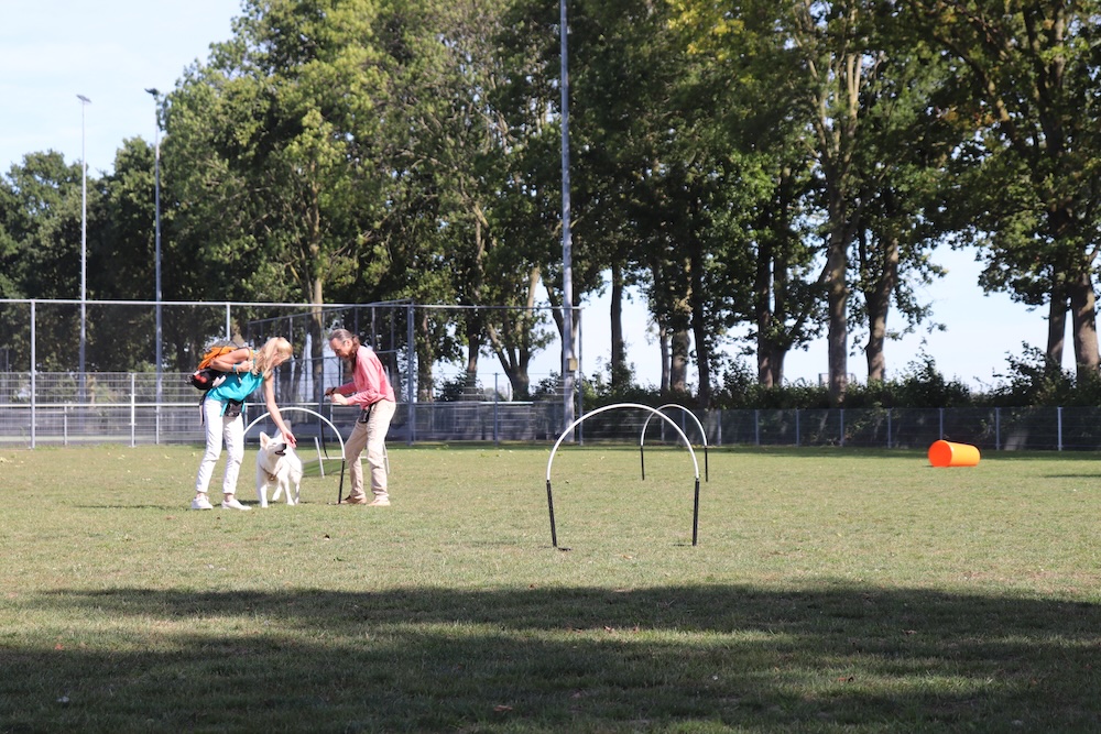 Na de demonstratie kon iedereen ervaren wat is nou Hoopers. En zo werden alle onderdelen uit het parcours los behandeld .Door de hoops, om een ton, een tunnel hier en daar en langs de gate. Wat begon als losse onderdelen werd al snel opgebouwd naar korte parcours. En wat zijn onze witjes toch slim